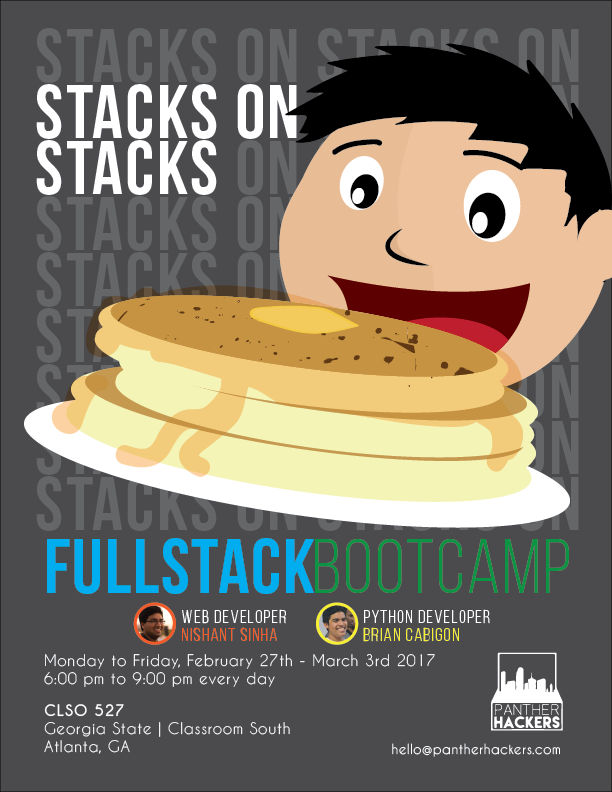 Event flyer for PantherHackers' weeklong workshop with full stack development. A committee member suggested pancakes as a graphic.